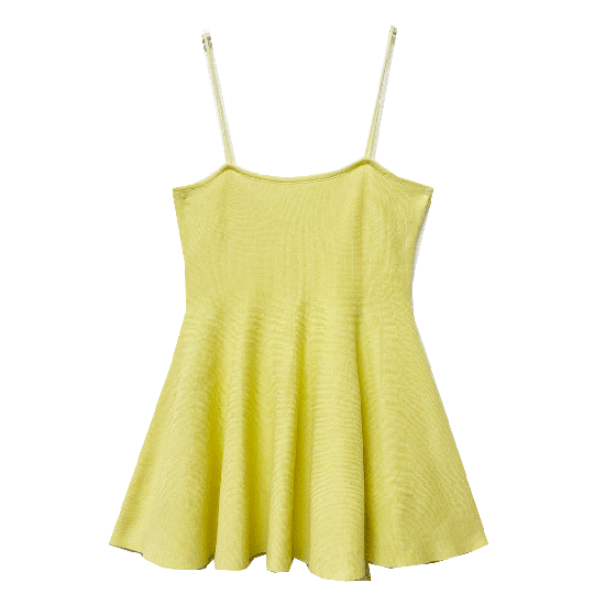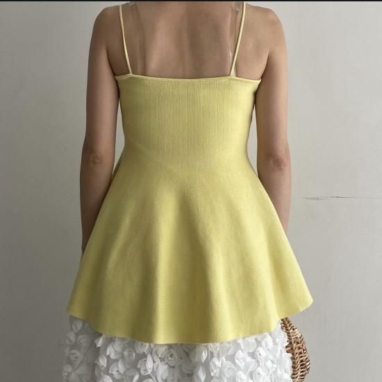 華奢なストラップとウエストから拡がるフレアが印章的なニット素材の