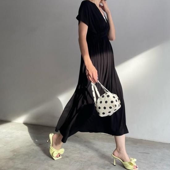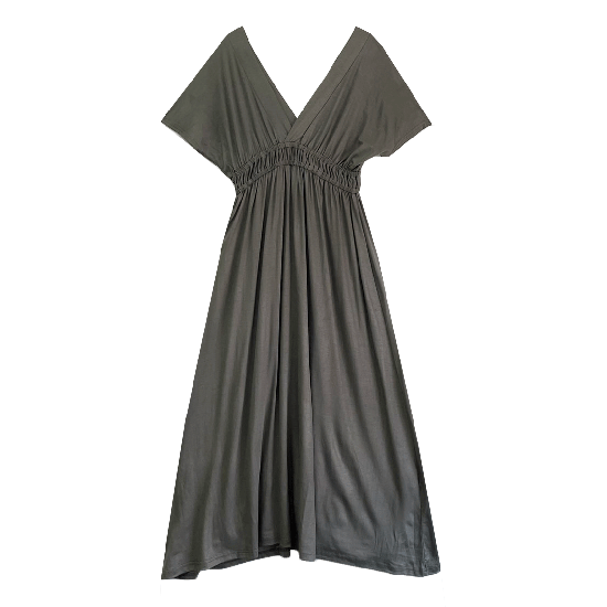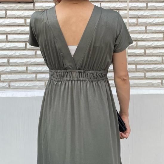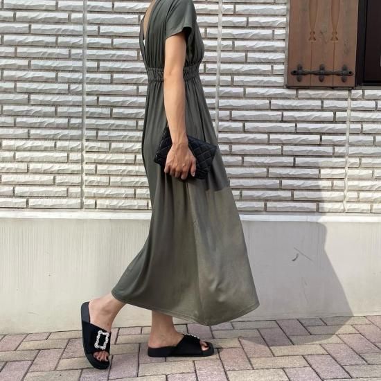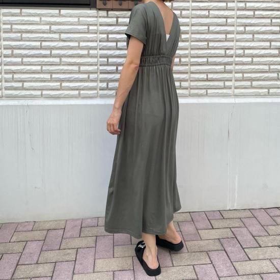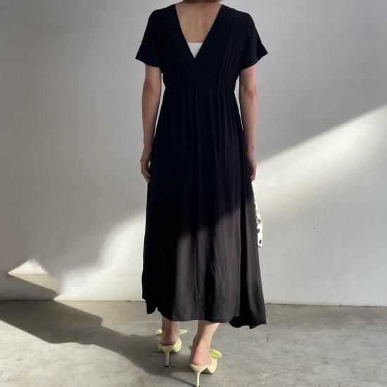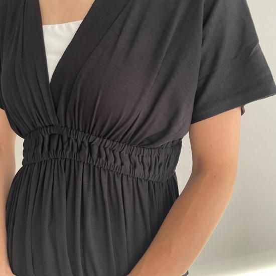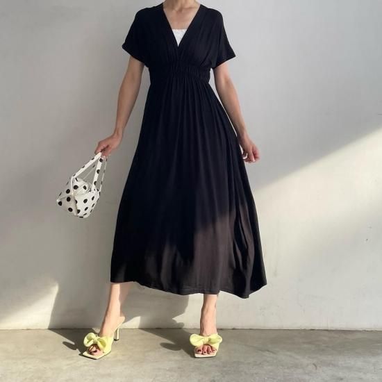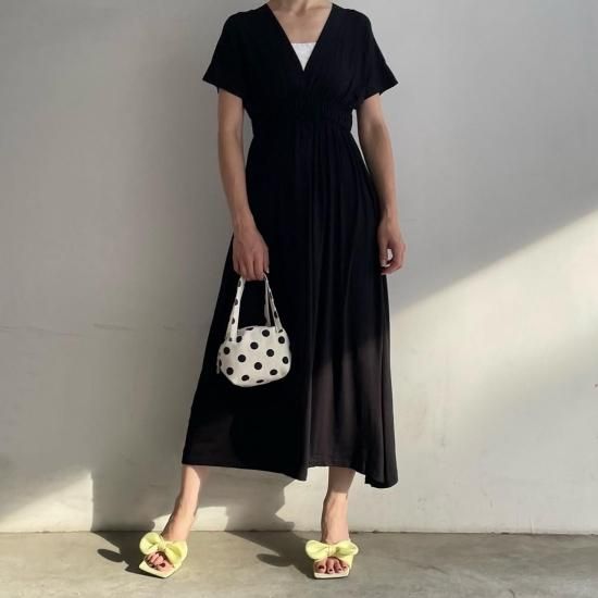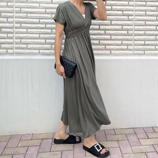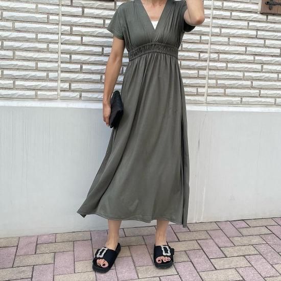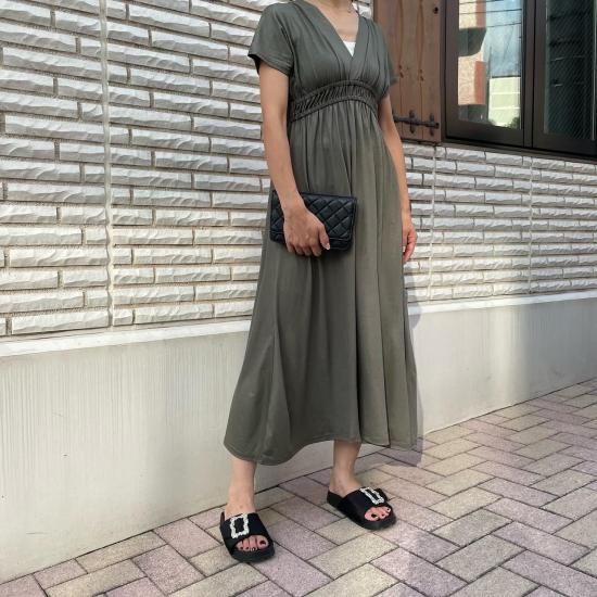 ウエスト周りのゴムギャザーがシンプルなワンピースにディティールを与えてくれます。