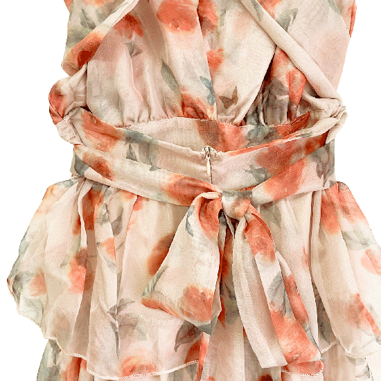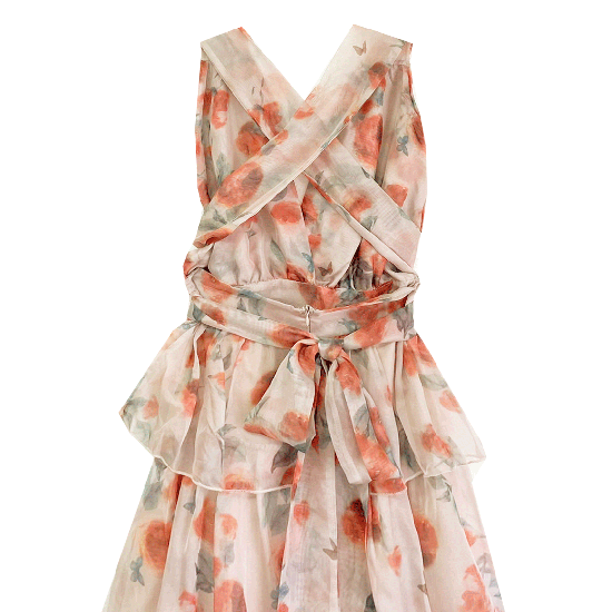 ホルターネックのような仕様で背中でクロスした後フロントを通り、また後ろでリボンにします。