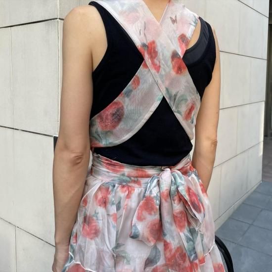 結び方は色々ですが背中空きを生かしてインナーを選べばいろんなシーンに活躍しそう。