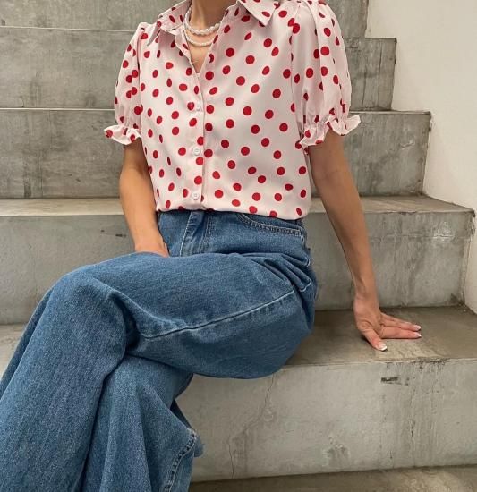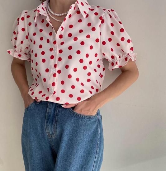 レトロでポップなドットのブラウス。ノスタルジックなカラーリングもポイントです。