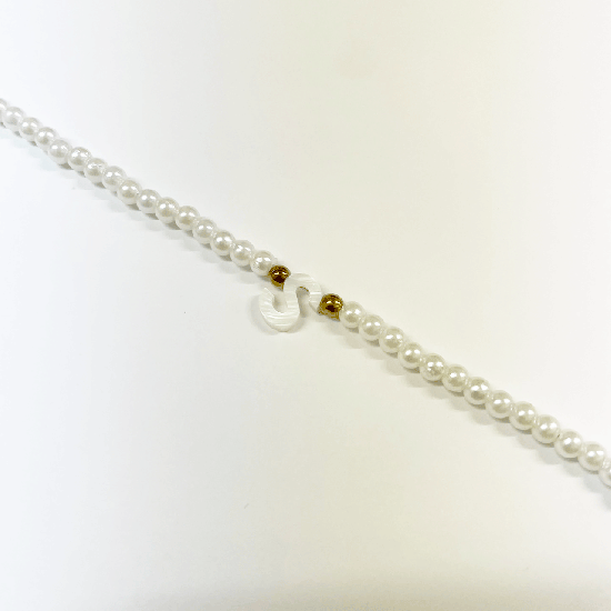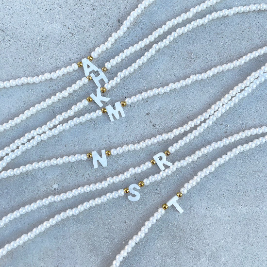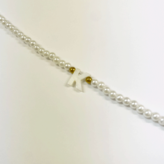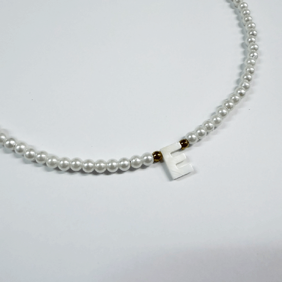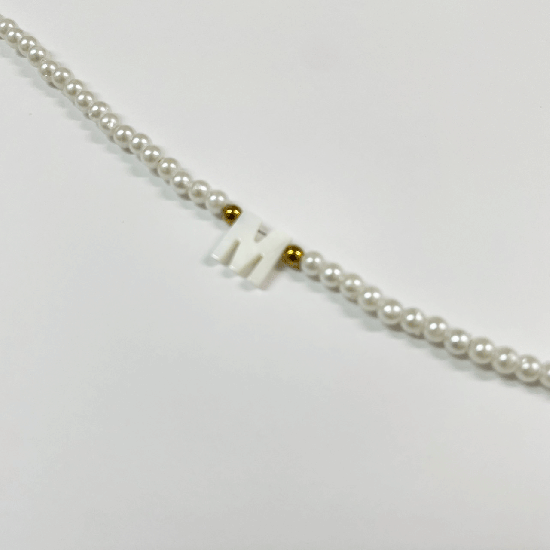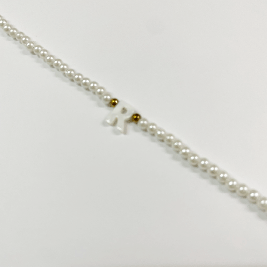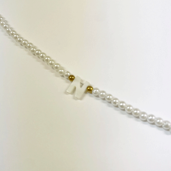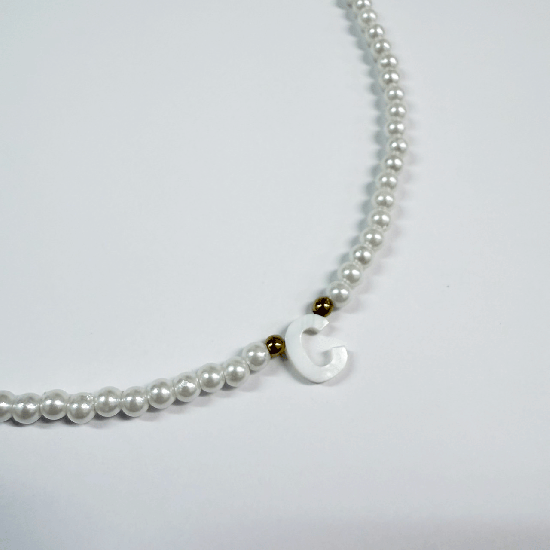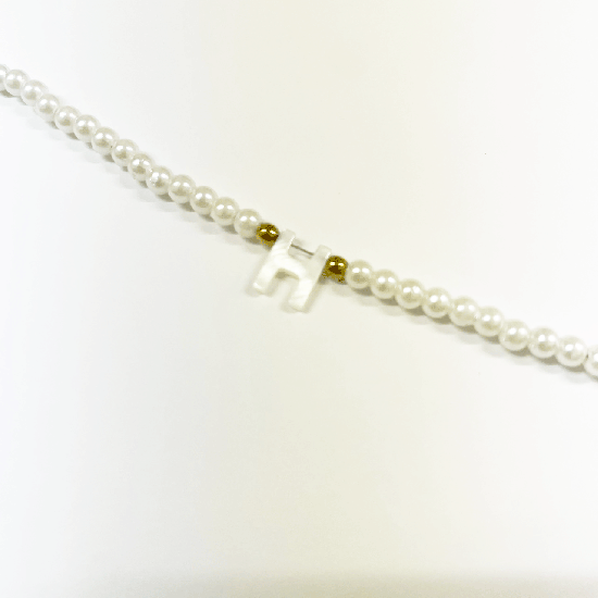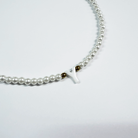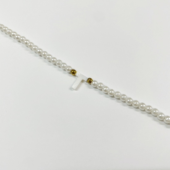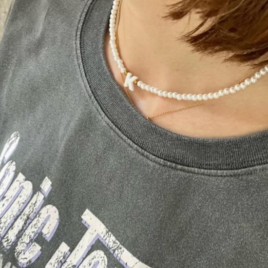 小粒のシンプルなパールにシェルのプチイニシャルが白いY Tシャツから