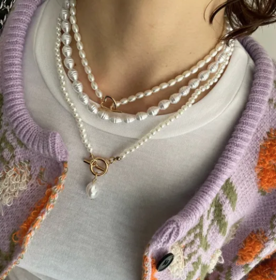 淡水モチーフの三連ネックレス。シンプルなシングルとノットがサークルとハートで