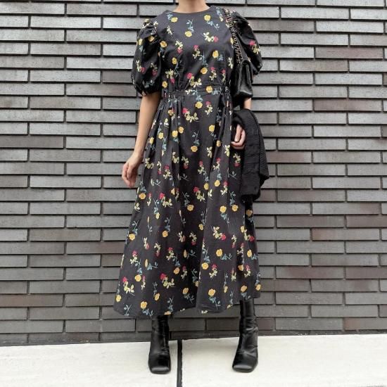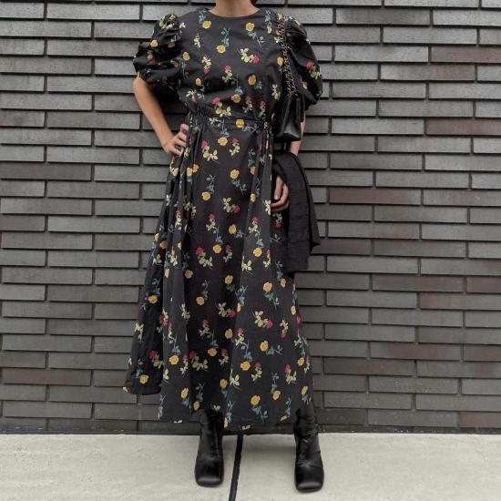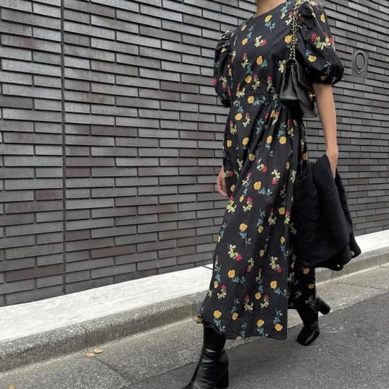 ボリュームスリーブの少し長め丈のワンピースはブーツと合わせて