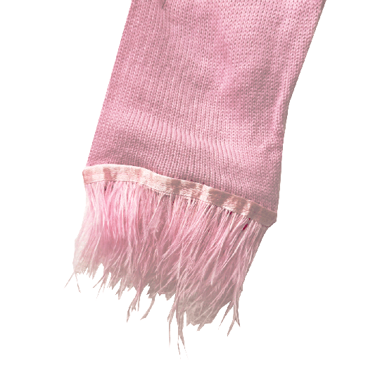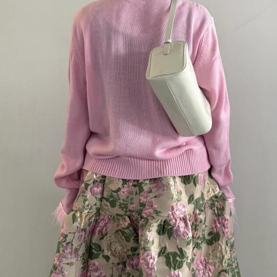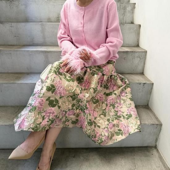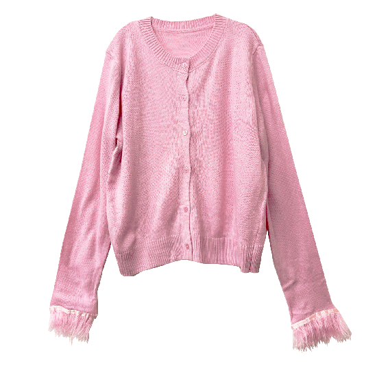 ボーイズシルエットのゆったりカーデについた袖口のフェザーがポイント。