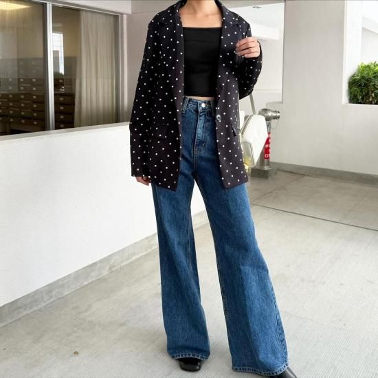 黒いジャケットは定番アイテムですがドット柄なら新鮮です。