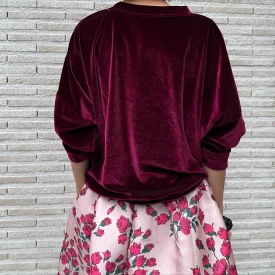 クラシカルなベロア素材もドロップショルダーのルーズシルエットでカジュアルダウン。